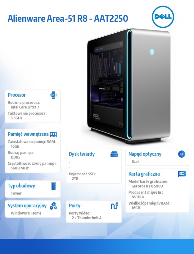 Opis dotyczy serii komputerów stacjonarnych Dell Alienware Area-51. Rzeczywiste cechy mogą się różnić w zależności od konfiguracji komputera.