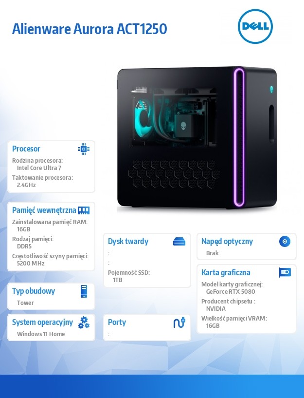 Komputer Alienware Aurora R17 - ACT1250 Win11 Home/ Core Ultra 7 265F/16GB/1TB/ NVIDIA GeForce RTX 5080/ 2Y AlienwareEliteCare