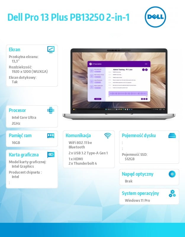 Opis dotyczy serii notebooków Dell Pro 13 Plus PB13250. Rzeczywiste cechy mogą się różnić w zależności od konfiguracji notebooka.