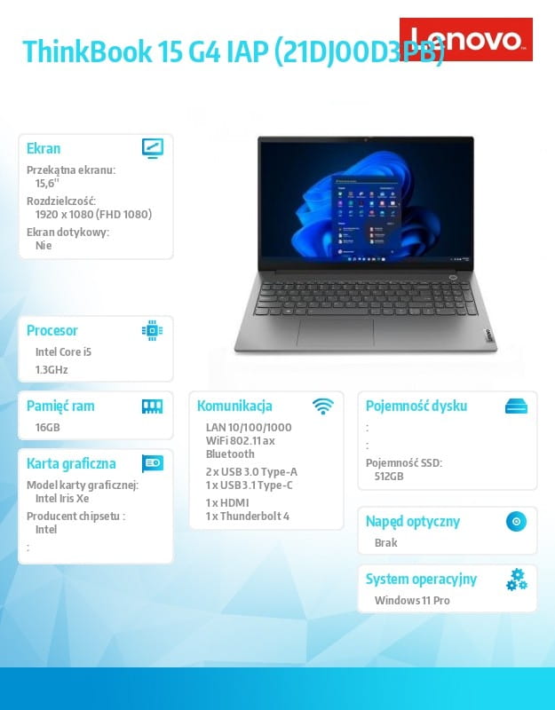 Laptop ThinkBook 15 G4 21DJ00D3PB W11Pro i5-1235U/16GB/512GB/INT/15.6 FHD/Mineral Grey/3YRS OS