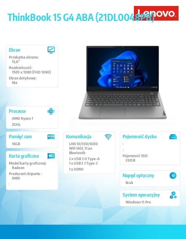 Laptop ThinkBook 15 G4 21DL0048PB W11Pro 5825U/16GB/512GB/INT/15.6 FHD/Mineral Grey/3YRS OS