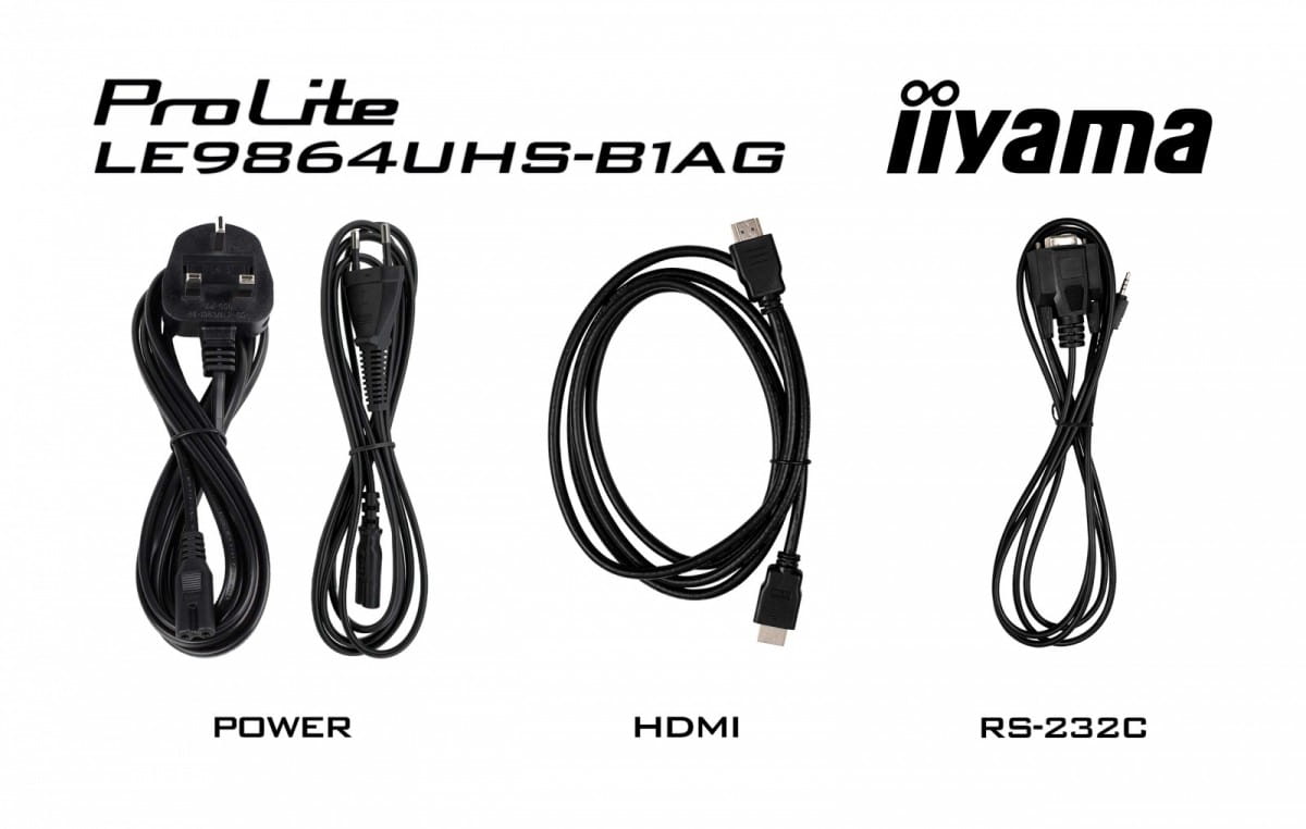 - Akcesoria w zestawie: Kabel zasilający Kabel HDMI Kabel RS-232c Skrócona instrukcja obsługi Instrukcja bezpieczeństwa Uchwyt do montażu na ścianie Prowadnica do montażu na ścianie Śruby Kotwy do śrub Naklejki na otwory na śruby Pilot (baterie w zestawie)
