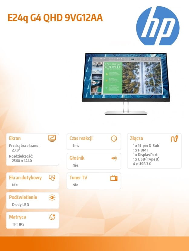 - Akcesoria w zestawie: Monitor Przewód DisplayPort 1.2 Przewód HDMI Przewód USB Type-B na A Arkusz szybkiej instalacji Zestaw dokumentacji Przewód zasilania sieciowego