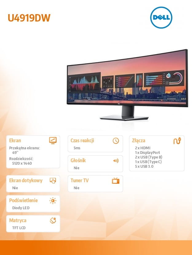 Monitor U4919DW 49 cali Curved QHD (5120x1440)/32:9/2xHDMI/DP/5xUSB/USB-C/3Y PPG
