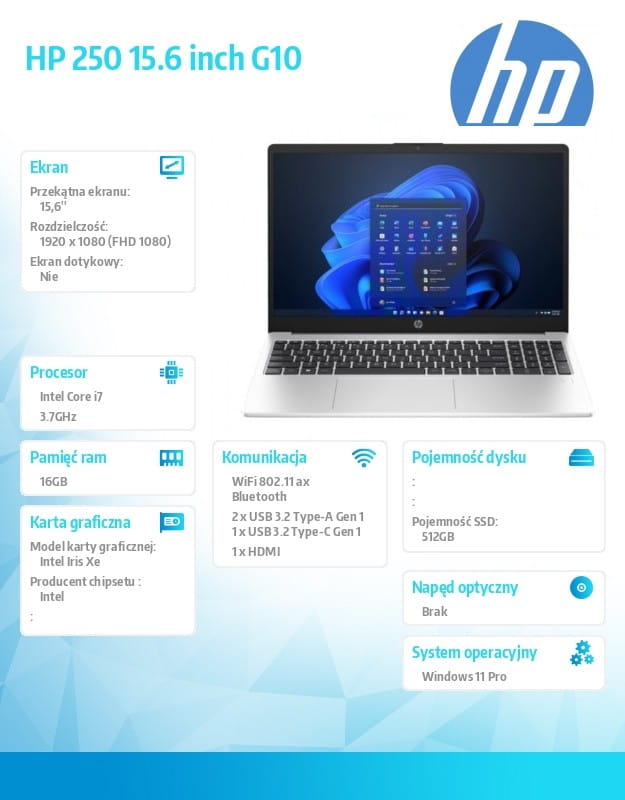 Laptop HP 250 G10 zapewnia podstawowe funkcje biznesowe w smukłej i lekkiej konstrukcji, którą można wszędzie ze sobą zabrać. 15,6-calowy ekran o 85-procentowym współczynniku proporcji do obudowy, wszechstronny procesor Intel, szybka pamięć RAM i optymalna pamięć masowa dostarczają potrzebnej wydajności, a pomocne porty pozwalają podłączyć różne urządzenia peryferyjne wszystko to w bardzo przystępnej cenie.