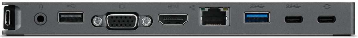 Stacja dokująca Lenovo Mini USB-C pozwala rozszerzyć opcje i dodać potężne możliwości za pomocą jednego połączenia USB-C. Naładuj każde starsze urządzenie za pomocą portów USB-A i bez wysiłku dodaj dodatkowy wyświetlacz 4K lub HD, sieć korporacyjną i zewnętrzne gniazdo audio typu combo 3,5 mm. W zależności od wielu czynników, takich jak możliwości przetwarzania urządzeń peryferyjnych, atrybutów plików i innych czynników związanych z konfiguracją systemu i środowiskami operacyjnymi, rzeczywista szybkość transferu przy użyciu różnych złączy USB w tym urządzeniu będzie się różnić i jest zwykle wolniejsza niż szybkość transmisji danych, ponieważ określone przez odpowiednie specyfikacje USB: - 5 Gbit / s dla USB 3.1 Gen 1; 10 Gbit / s dla USB 3.1 Gen 2 i 20 Gbit / s dla USB 3.2.