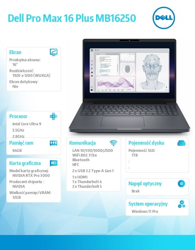 Stacja robocza Dell Pro Max 16 Plus MB16250 W11P U9-285HX|64GB|1TB|RTX PRO 3000 Blackwell 12GB|FgrPr&SmtCd|WLAN+BT|16.0 FHD|BcklKb|6 Cell|vPro/3Y